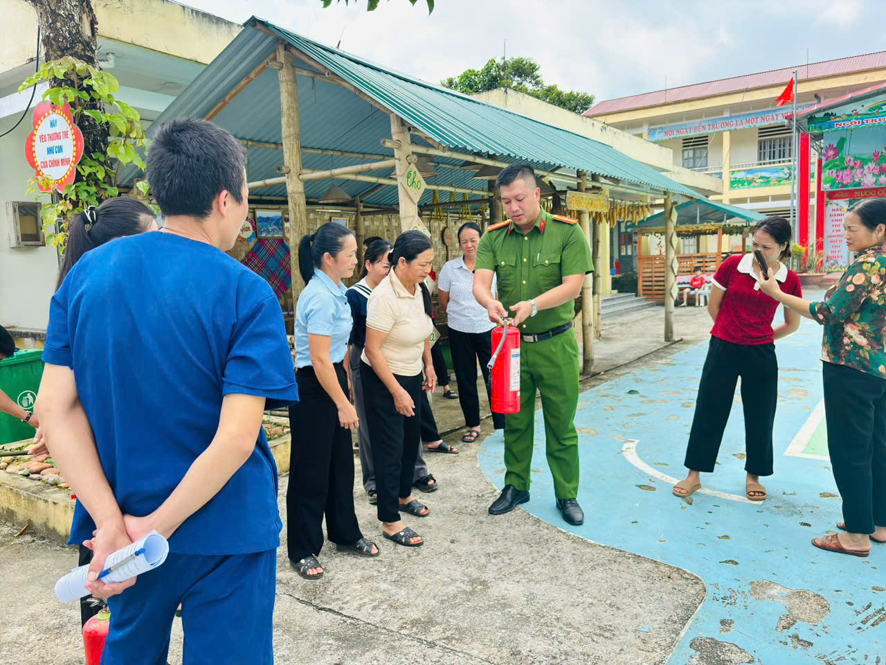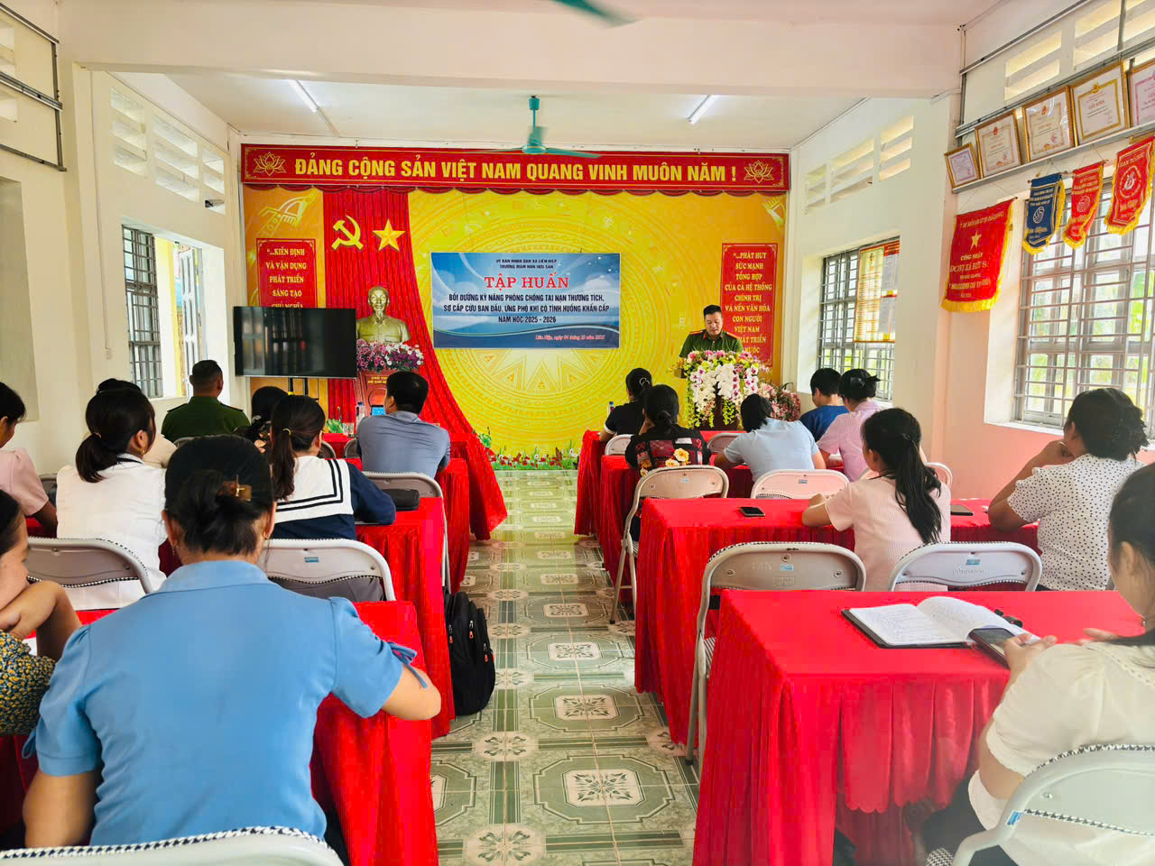 Tại Trường Mầm non Hữu Sản, ngày 04/10/2025 Công an xã đã trực tiếp tuyên truyền, hướng dẫn giáo viên nhà trường các kỹ năng phòng chống tai nạn thương tích, sơ cấp cứu ban đầu, ứng phó khi có tình huống khẩn cấp xảy ra, qua đó giúp các thầy, cô giáo nhận diện các nguy cơ gây tai nạn thương tích trong trường học, các kỹ năng sơ cấp cứu ban đầu đối với các tai nạn thường gặp ở trẻ mầm non, các kỹ năng ứng phó với các tình huống khẩn cấp…