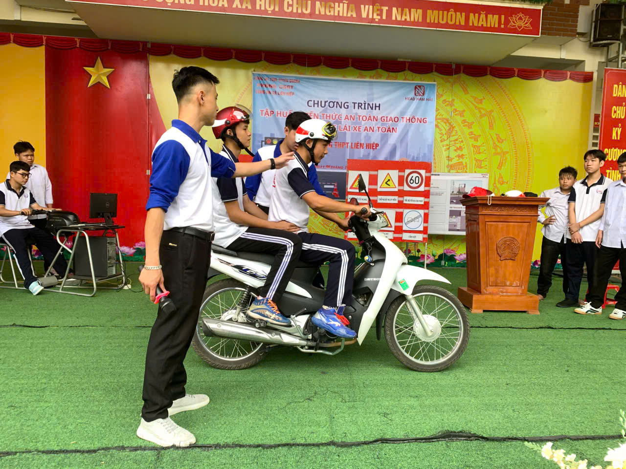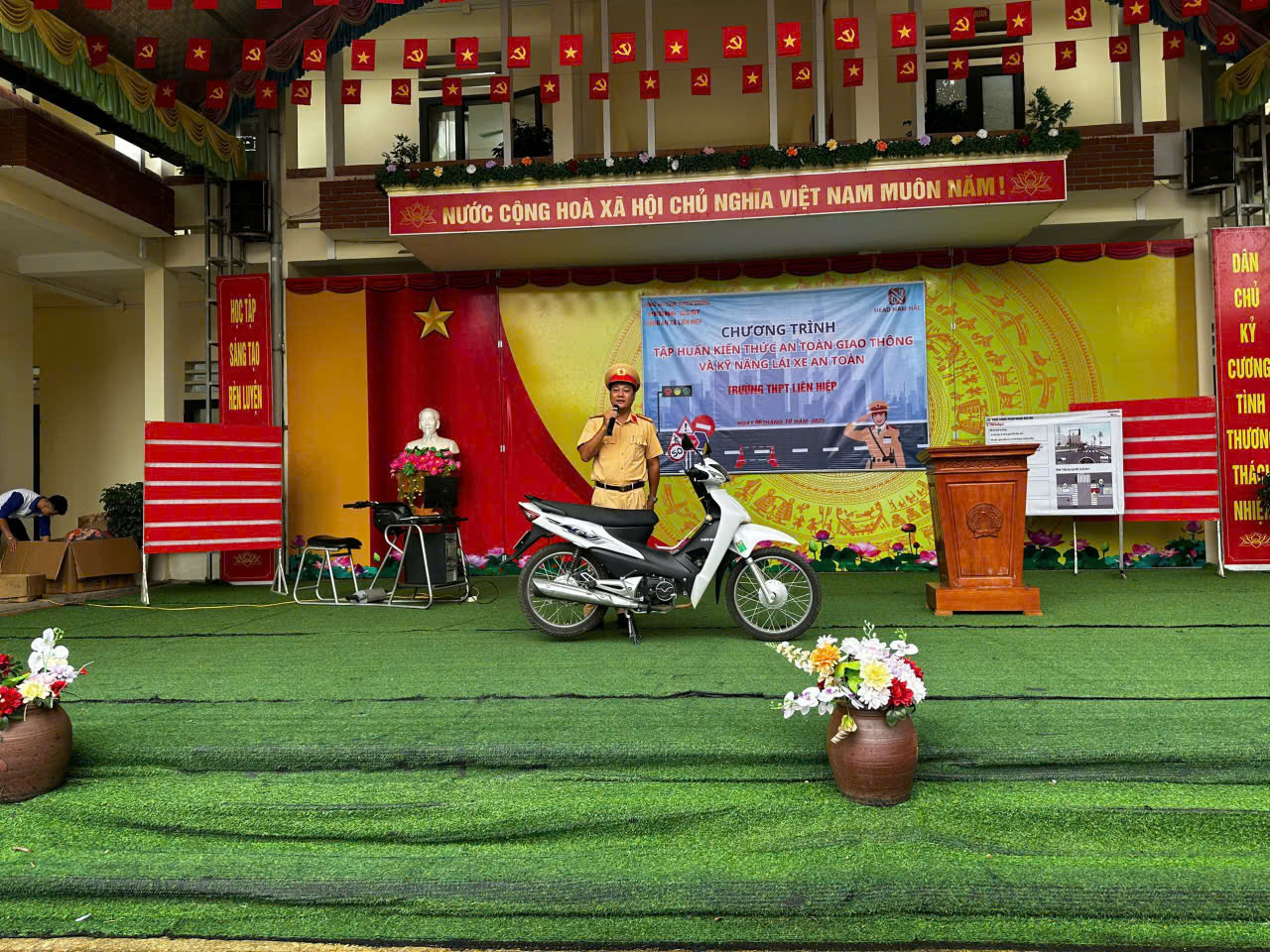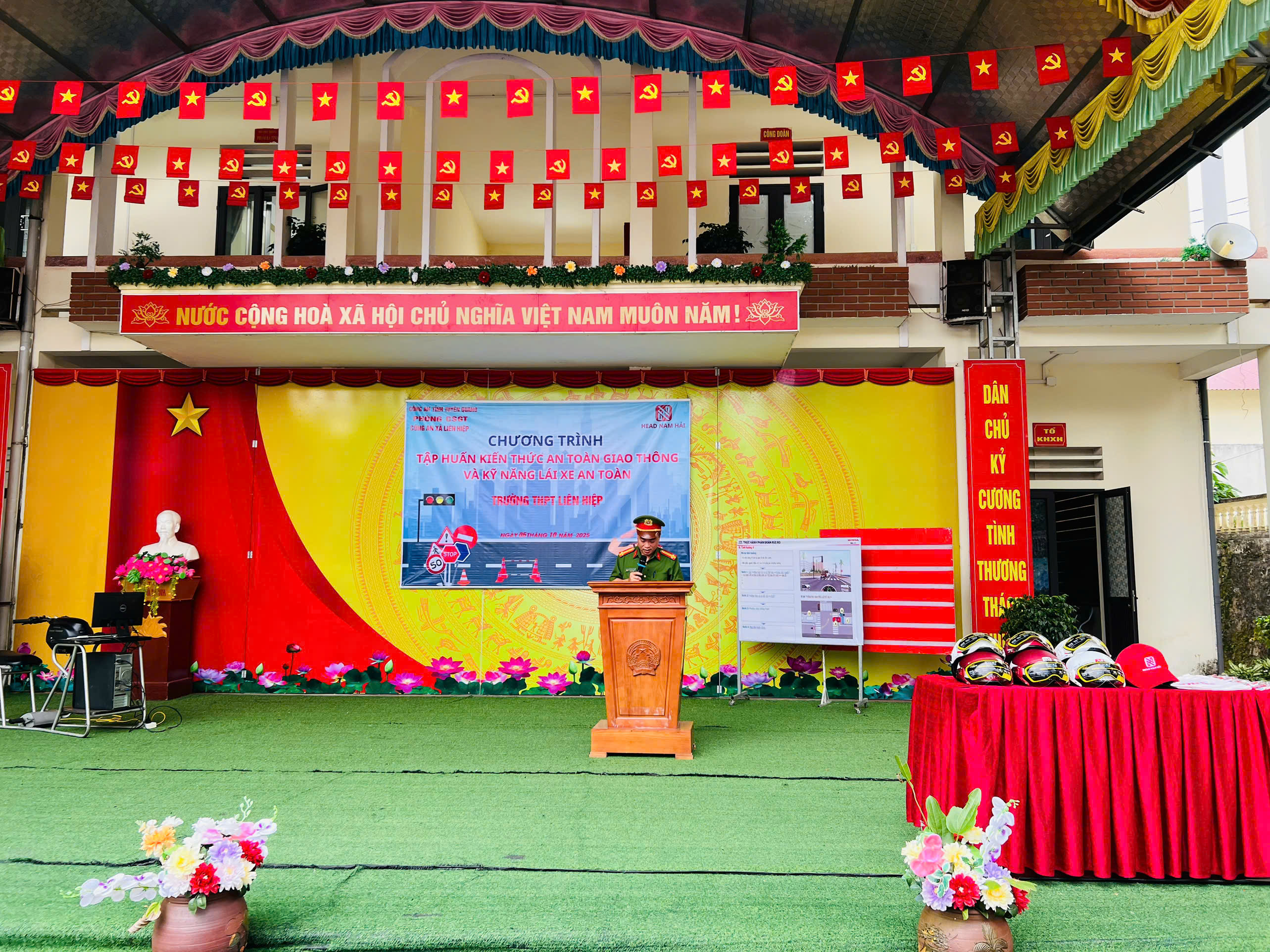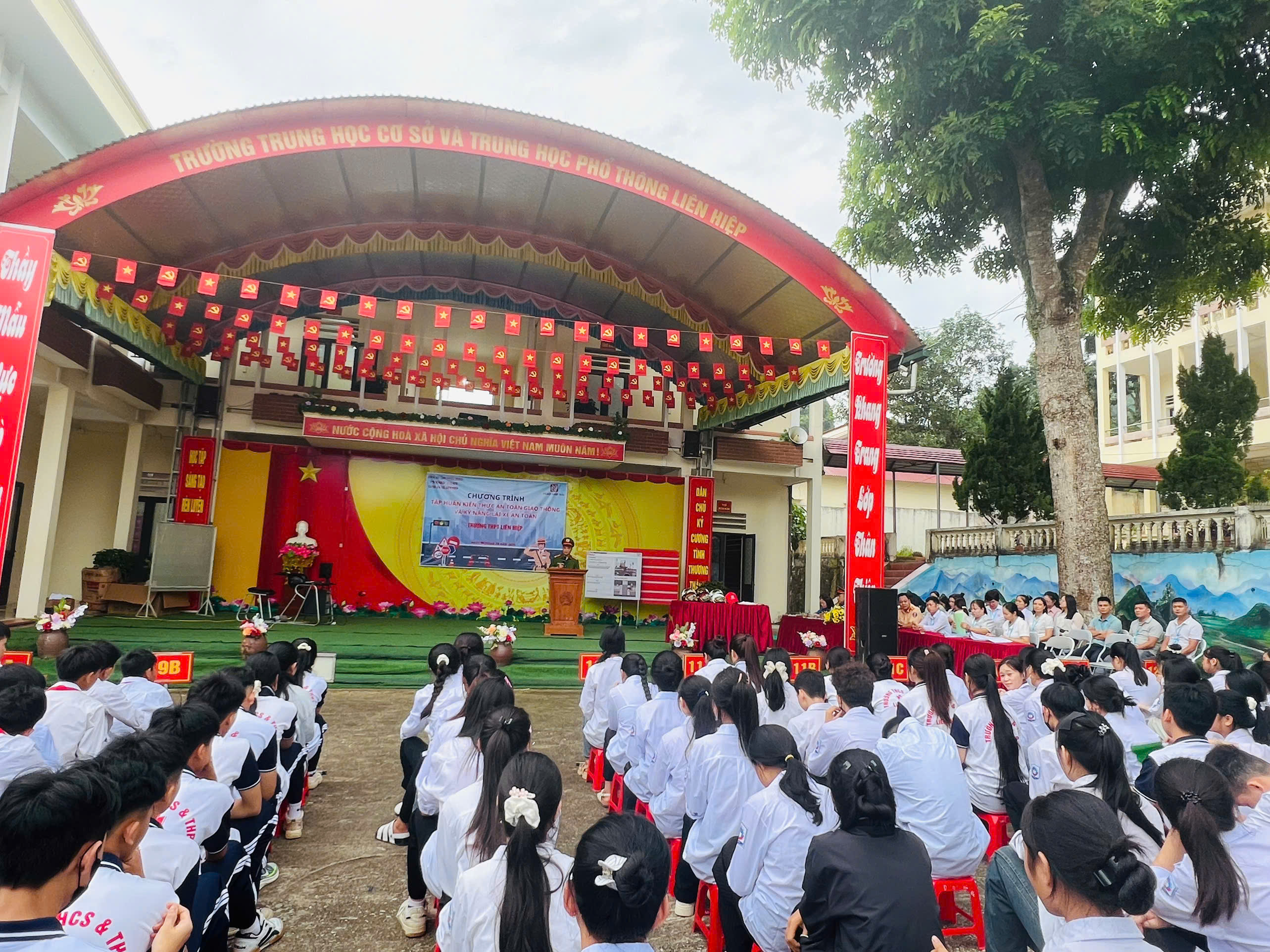 Tiếp đó, ngày 06/10/2025 tại Trường THCS và THPT Liên Hiệp, Công an xã phối hợp cùng Phòng CSGT Công an tỉnh, Công ty Honda Nam Hải đã tổ chức buổi tuyên truyền pháp luật cho thầy cô giáo và học sinh trong nhà trường. Buổi tuyên truyền có sự tham gia Ban giám hiệu, các thầy cô giáo và hơn 700 em học sinh nhà trường. Tại đây, cán bộ Công an xã và cán bộ Phòng CSGT, Công ty Honda Nam Hải đã trực tiếp truyền đạt các nội dung pháp luật thiết thực, liên quan mật thiết đến học sinh, như: Một số nội dung cơ bản của Luật trật tự an toàn giao thông đường bộ; một số kỹ năng kiểm tra kỹ thuật phương tiện trước khi tham gia giao thông; Một số thủ đoạn, cách phòng tránh của tội phạm sử dụng công nghệ cao; Luật phòng, chống bạo lực học đường; Kỹ năng điều khiển xe an toàn.